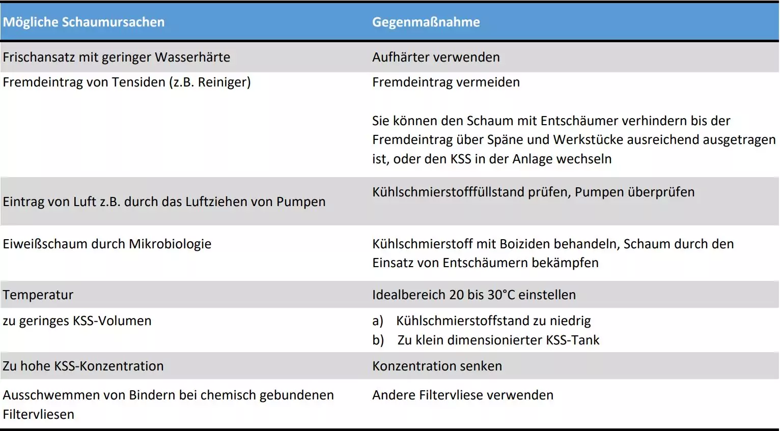 Die häufigste und naheliegendste Ursache für unstabilen Schaum ist eine geringe Oberflächenspannung im KSS. Oft finden wir diese Schaumart in kürzlich neu befüllten KSS-Anlagen, wenn der Kühlschmierstoff mit sehr weichem, enthärteten oder VE-Wasser angesetzt wird. Als vorbeugende Maßnahme kann das Ansetzwasser für die frisch Befüllung z.B. künstlich aufgehärtet werden. Auch ein kontrolliertes Aufhärten der „unstabil schäumenden“ Emulsion schafft schnell und sicher Abhilfe. Sobald der KSS ausreichend aufgehärtet ist legt sich das Schaumproblem und tritt in der Regel nicht wieder auf.